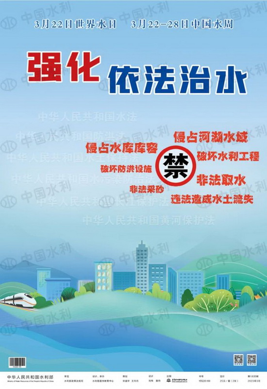 水利部日前审定发布第三十一届“世界水日”、第三十六届“中国水周”主题宣传画。 2023年3月22日是第三十一届“世界水日”,3月22—28日是第三十六届“中国水周”。联合国确定2023年“世界水日”主题为“Accelerating Change”(加速变革)。我国纪念2023年“世界水日”“中国水周”活动主题为“强化依法治水 携手共护母亲河”。