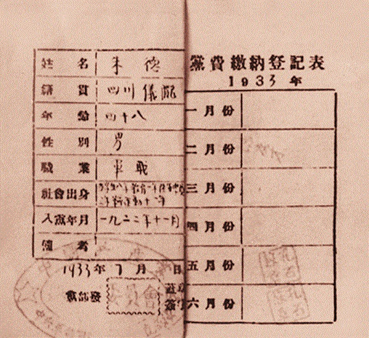 1933年7月,中革军委直属队发给朱德的“党费缴纳登记表”